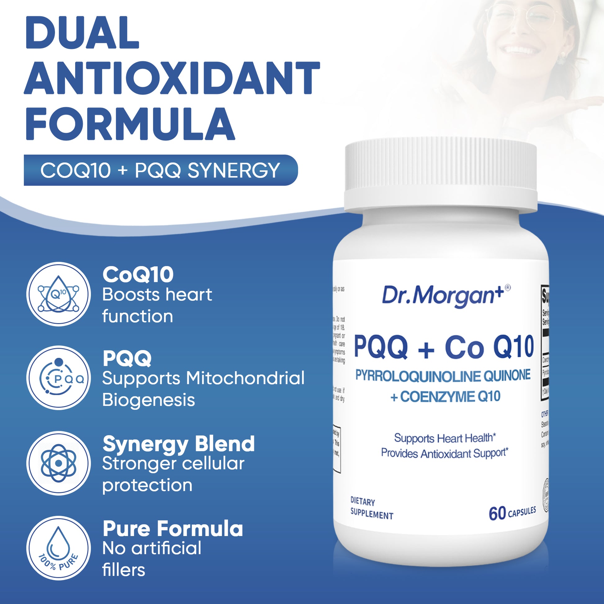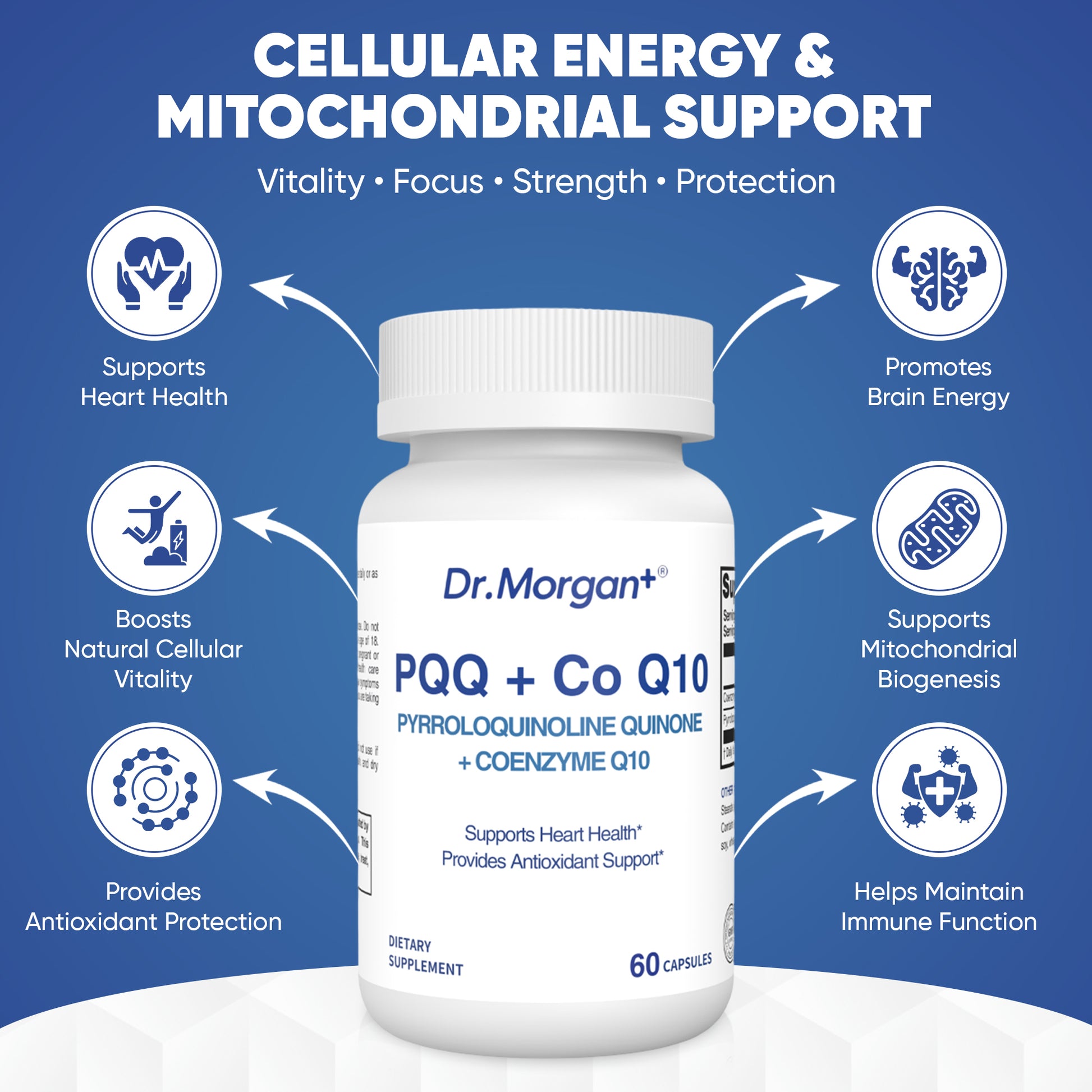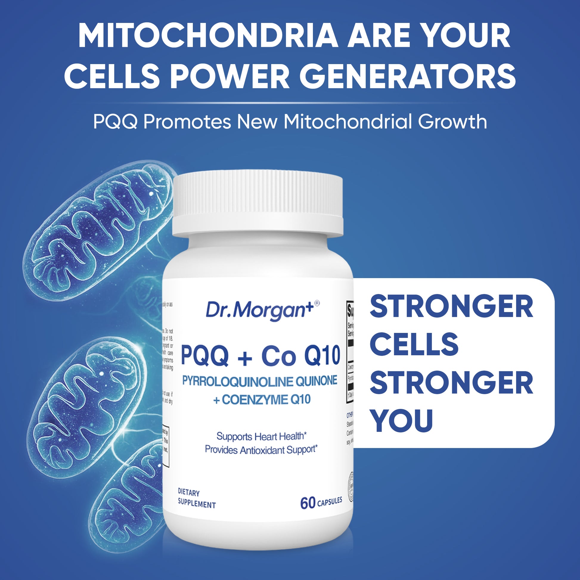 Dr. Morgan+ is dedicated to providing high-quality, scientifically validated supplements focused on cardiovascular health, particularly in the areas of antioxidant support and cellular energy metabolism. This formula combines PQQ (Pyrroloquinoline Quinone) and Coenzyme Q10 to support heart health and provide powerful antioxidant protection.