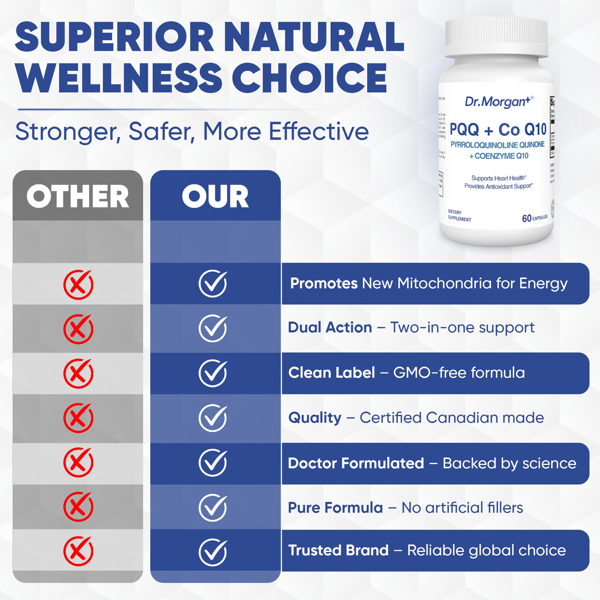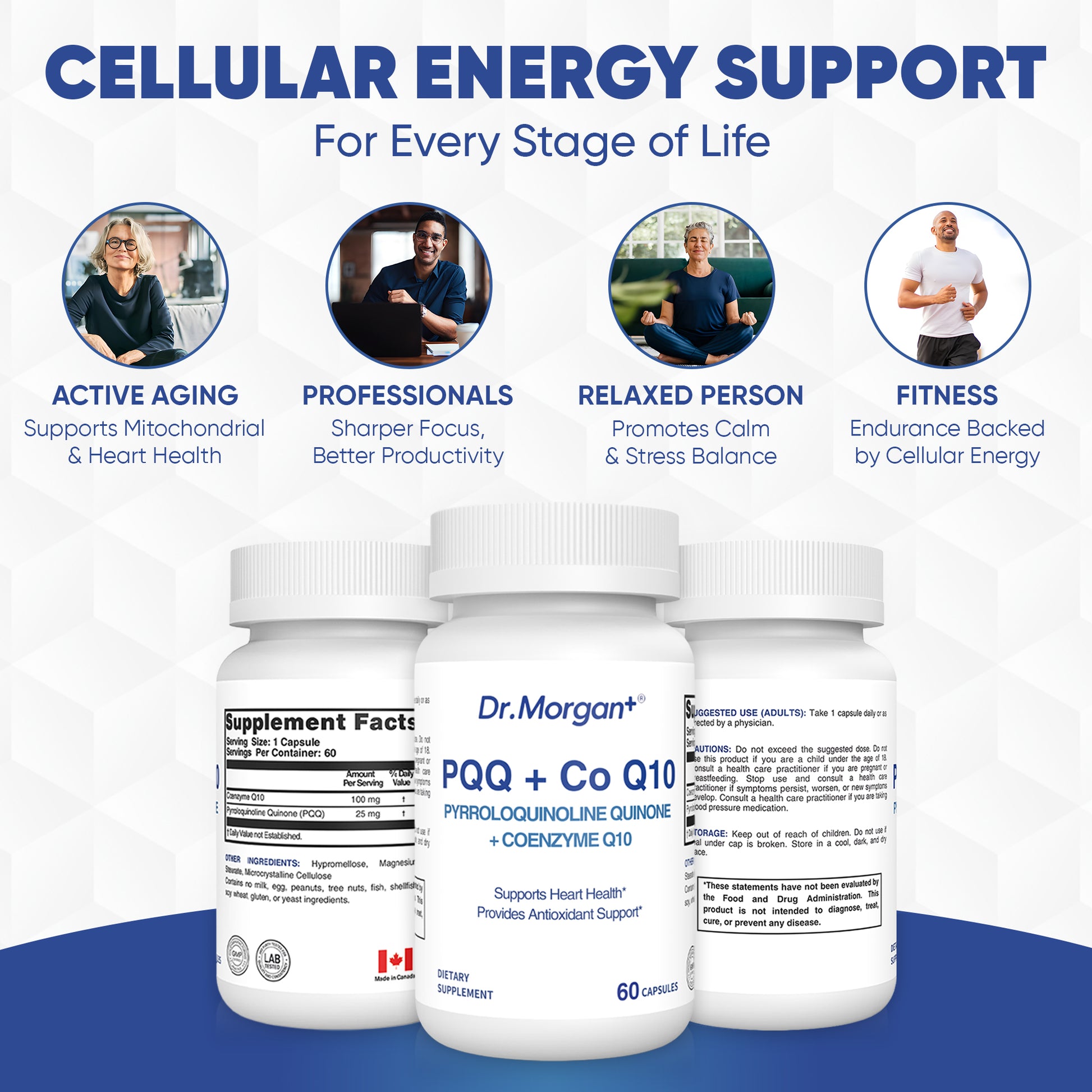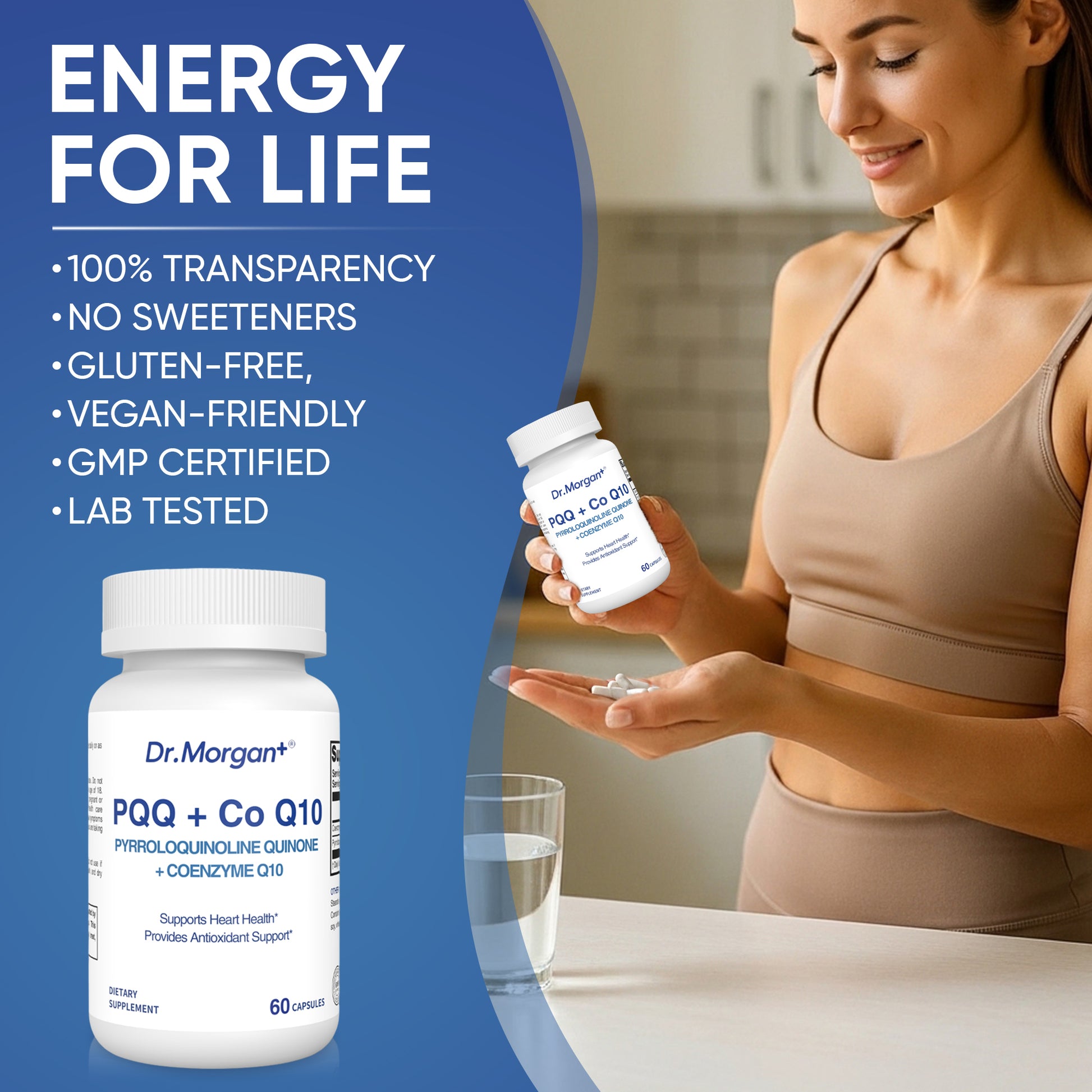 Dr. Morgan+ is dedicated to providing high-quality, scientifically validated supplements focused on cardiovascular health, particularly in the areas of antioxidant support and cellular energy metabolism. This formula combines PQQ (Pyrroloquinoline Quinone) and Coenzyme Q10 to support heart health and provide powerful antioxidant protection.
